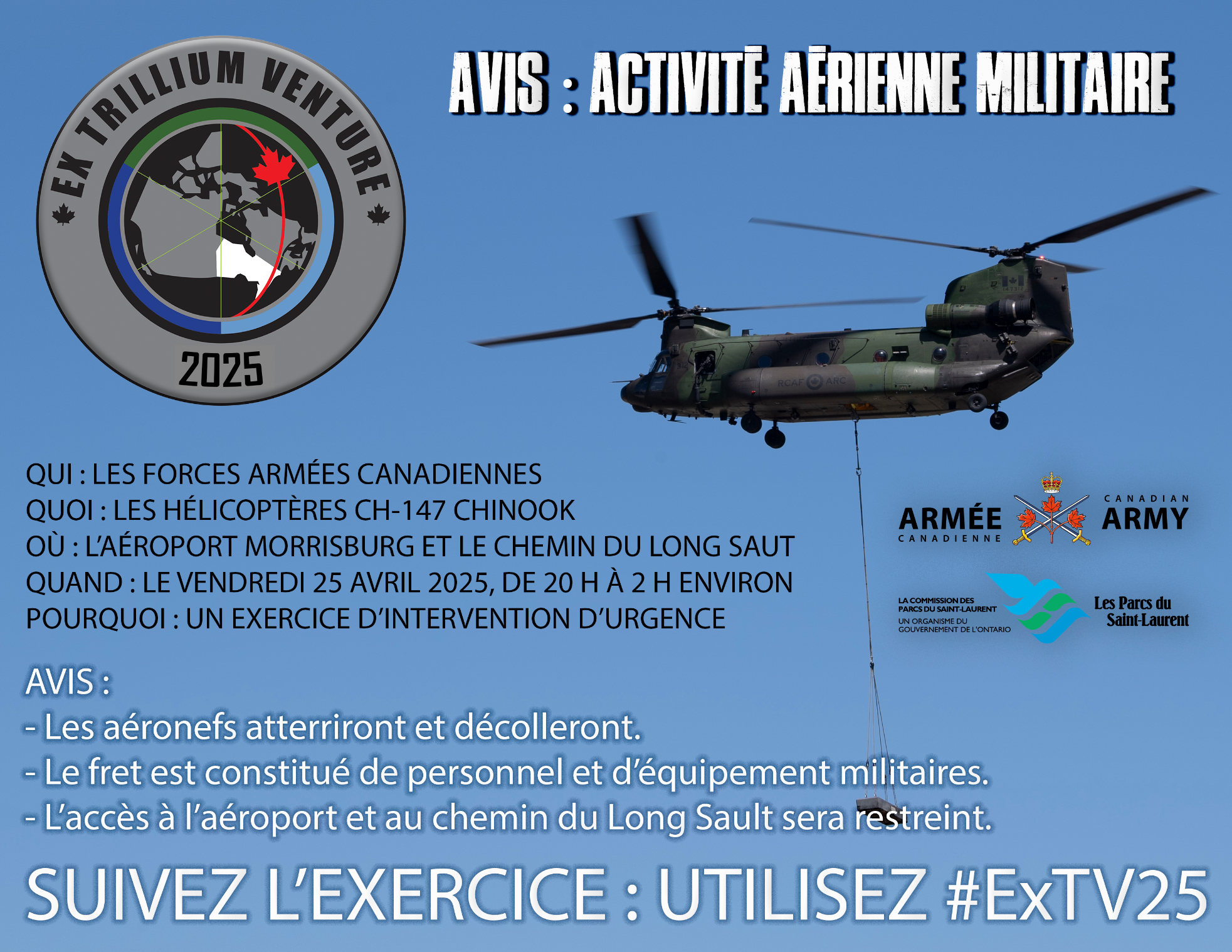 La Commission des parcs du St-Laurent est heureuse de soutenir l’exercice TRILLIUM VENTURE, une importante opération d’entraînement des Forces armées canadiennes qui se déroule partout en Ontario. Dans le cadre de cet important exercice, le chemin du Long Sault, géré par les Parcs du St-Laurent, sera fermé au public du 25 au 27 avril pour accueillir du personnel et du matériel militaire. Les terrains de camping et les aires de fréquentation diurne des parcs du St-Laurent le long du chemin Long Sault seront également utilisés pendant cette période; toutefois, ces zones ne sont pas encore ouvertes pour la saison 2025. Veuillez noter que le marathon du St-Laurent aura également lieu le samedi 26 avril 2025, sur toute la longueur du chemin du Long Sault. L’exercice militaire a été coordonné afin de garantir qu’il n’interfère pas avec la course.